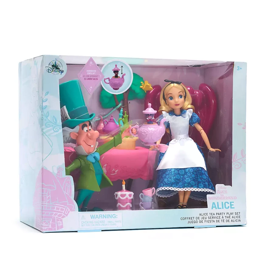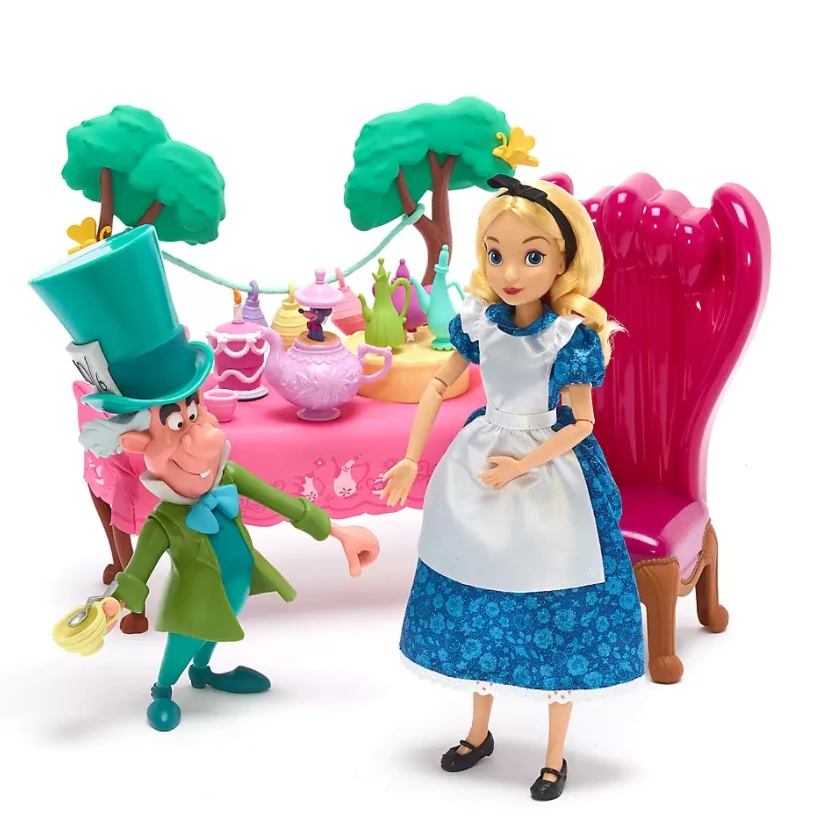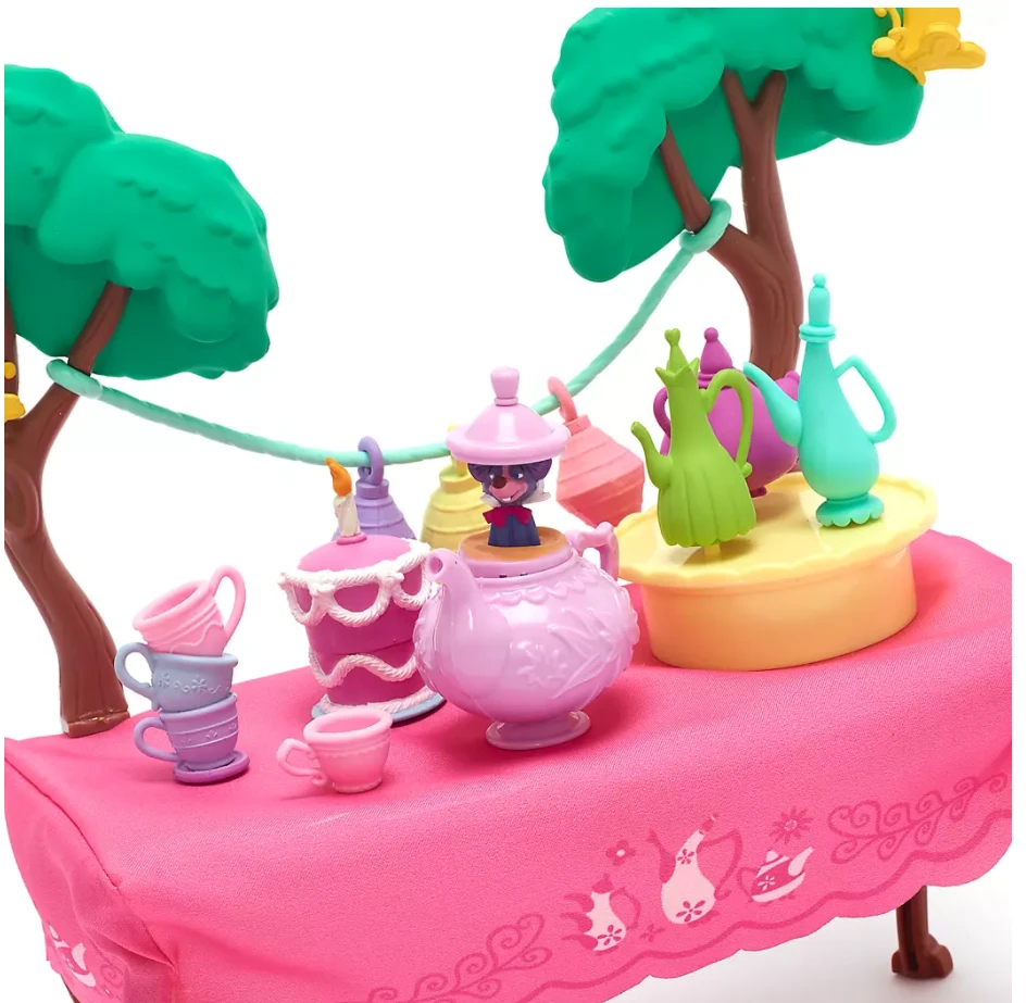 - Includes: Alice doll, Mad Hatter doll, cake, Dormouse in teapot, spoon, chair, small teacup and plate, table, 1 stack of cups, 1 spinning table with teapots, 2 trees and 3 Lanterns