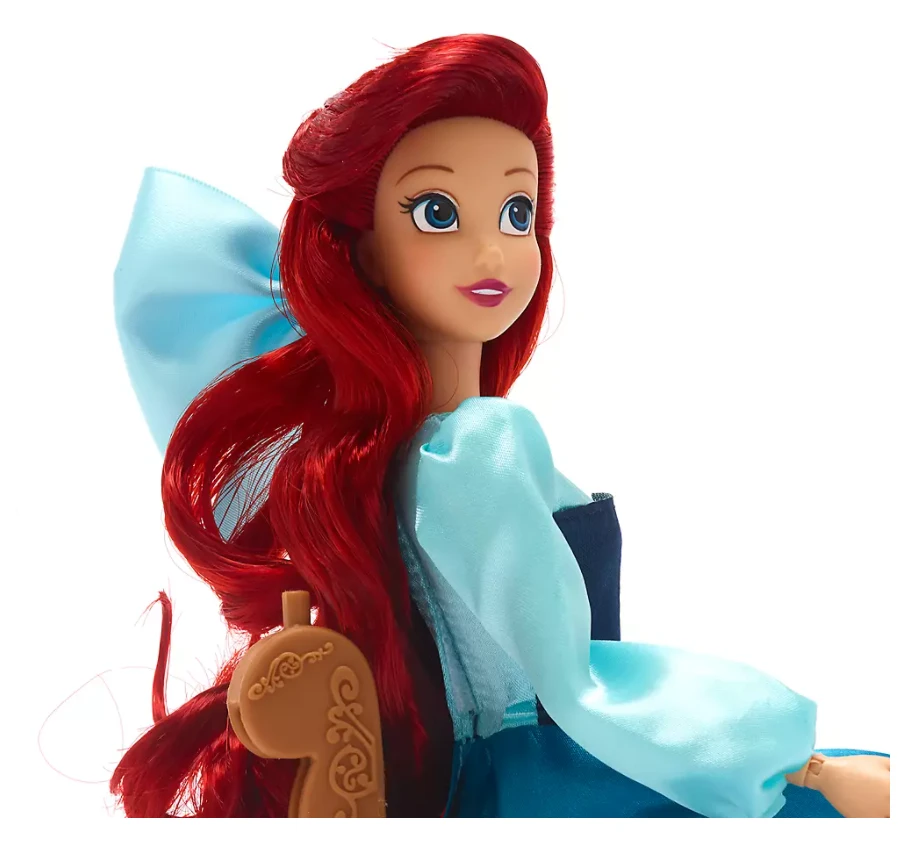 - Ariel features realistic, rooted hair with bow accessory