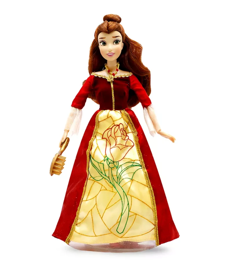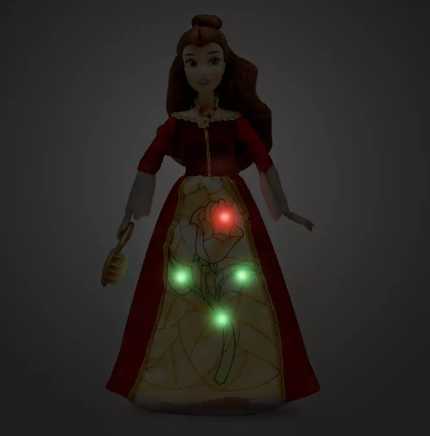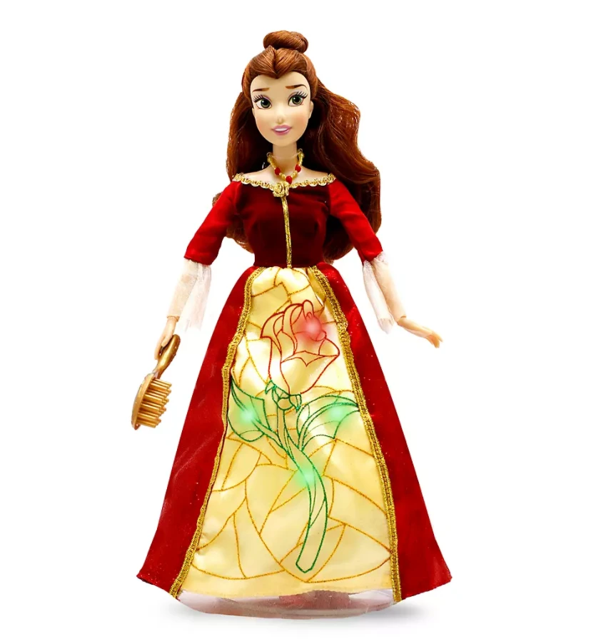 Belle comes to life as a beautiful premium doll adorned in a light-up dress with magical sounds. Glittering rose filigree, sheer organza trims, and a golden rosette brooch cast a spell of enchantment on all who see her.