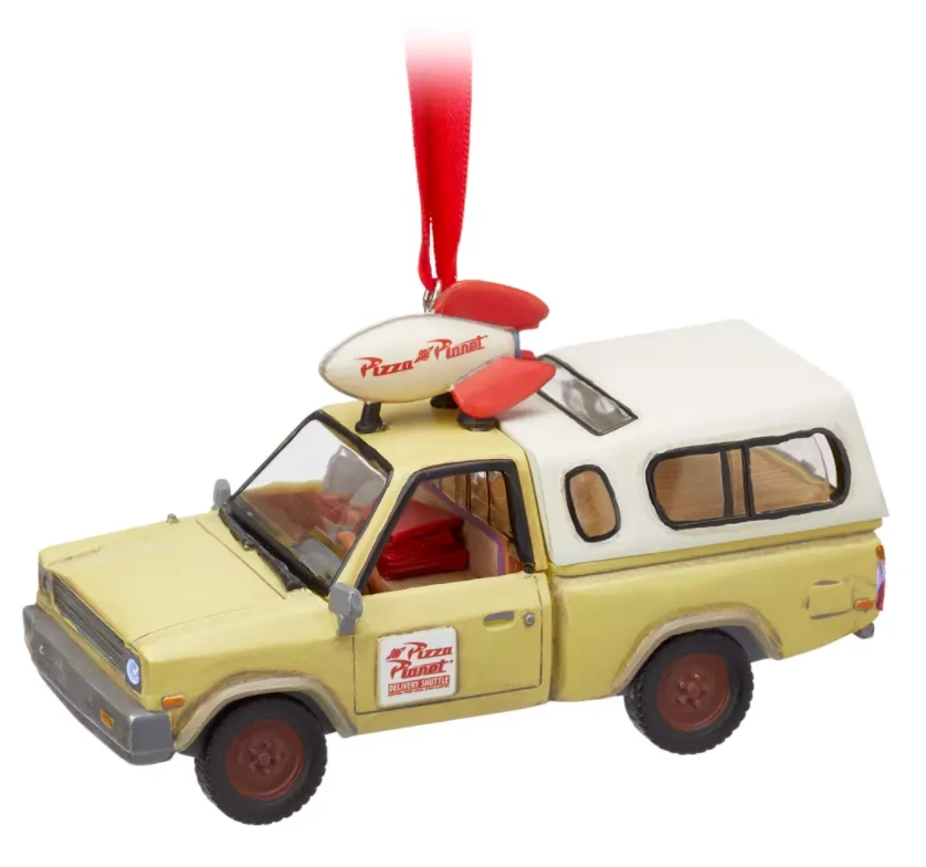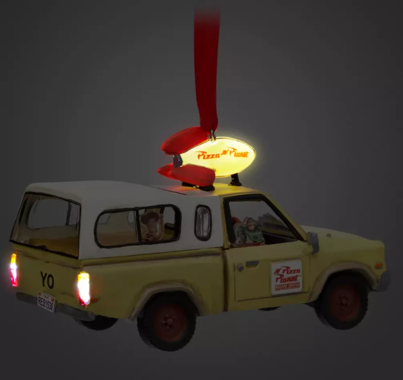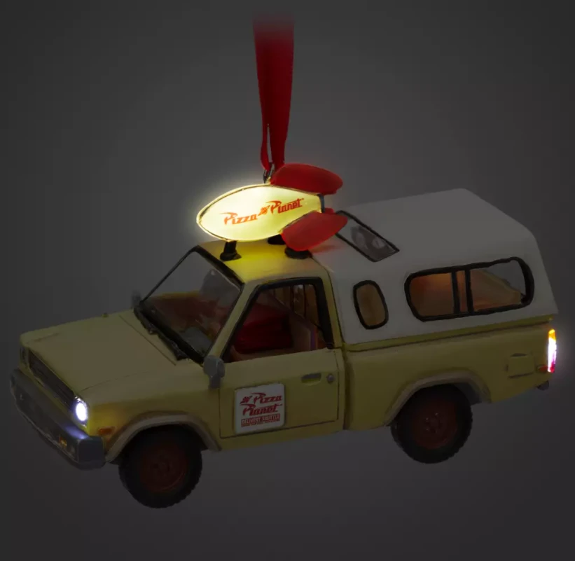 Deliver the goods this holiday season with a Toy Story-inspired truck ornament featuring a light-up Pizza Planet logo sign on roof, plus Woody and Buzz cutouts inside. Guaranteed fresh and hot!